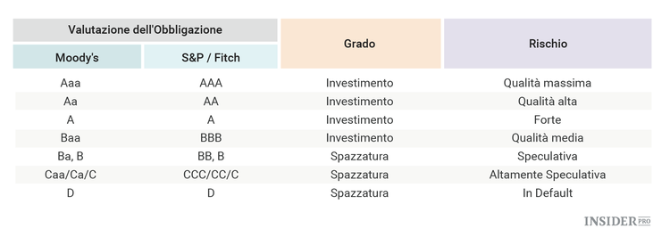 Il sistema di classificazione delle obbligazioni aiuta gli investitori a determinare il rischio di credito di una società. La classifica delle obbligazioni va considerata come una pagella della classificazione creditizia di una società. Le società blue-chip, che sono gli investimenti più sicuri, hanno una posizione alta, mentre le società ad alto rischio, hanno una posizione bassa. La tabella seguente illustra la scala di valutazione di diverse obbligazioni secondo le maggiori agenzie di valutazione degli USA: Moody's, Standard and Poor's e Fitch Ratings.