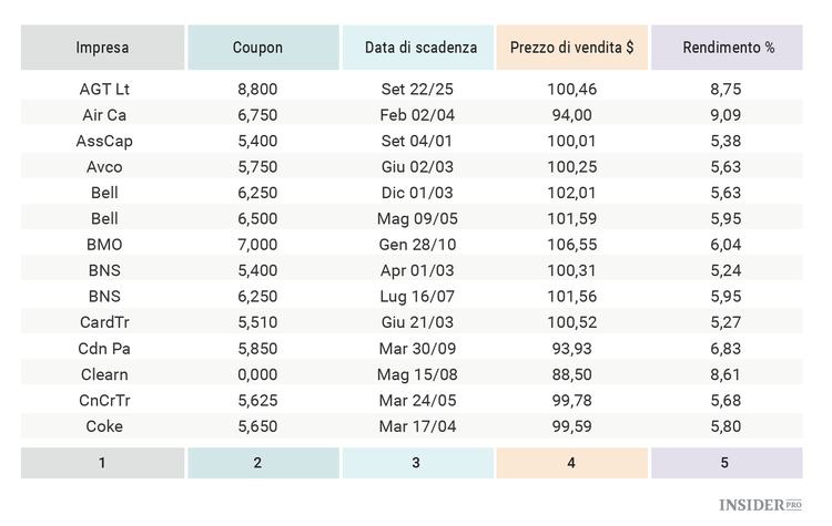 - Colonna 1: Emittente – Questa è la compagnia, o stato (o provincia) o nazione che emette l’obbligazione.