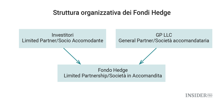 Dal punto di vista strutturale un fondo hedge presenta alcune analogie con un fondo comune. Ad esempio, proprio come un fondo comune, un fondo hedge è un veicolo di investimento collettivo che investe in azioni, bond, opzioni e diversi altri titoli. Può anche essere gestito da un manager a sé stante, un po’ come un consulente aggiunto gestisce un fondo comune distribuito da una grande società di fondi comuni. Tuttavia le analogie finiscono qui. Il ventaglio delle strategie di investimento a disposizione dei fondi hedge e il tipo di posizioni che possono assumere sono piuttosto ampi e, in molti casi, estremamente complessi. Ci concentreremo sulle specifiche strategie più avanti, per il momento invece ci occuperemo di come sono strutturati i fondi hedge.