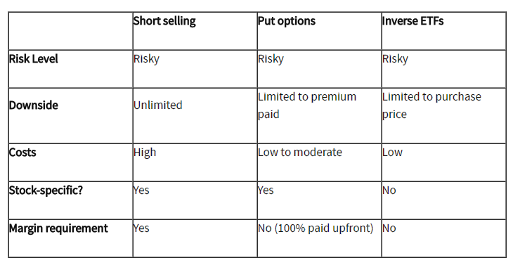 Chi desidera operare seguendo una prospettiva al ribasso su un’azione o un settore in particulare, oppure sul mercato in generale, ha a disposizione un paio di alternative alla vendita allo scoperto: opzioni put e exchange-traded funds (ETF) a rendimento inverso.